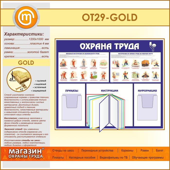 Стенд «Охрана труда» с перекидной системой и 2 объемными карманами (OT-29-GOLD) в Сургуте купить