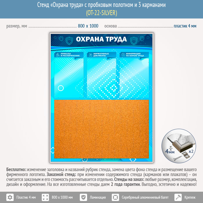 Стенд «Охрана труда» с пробковым полотном и 3 карманами (OT-22-SILVER) в Сургуте купить