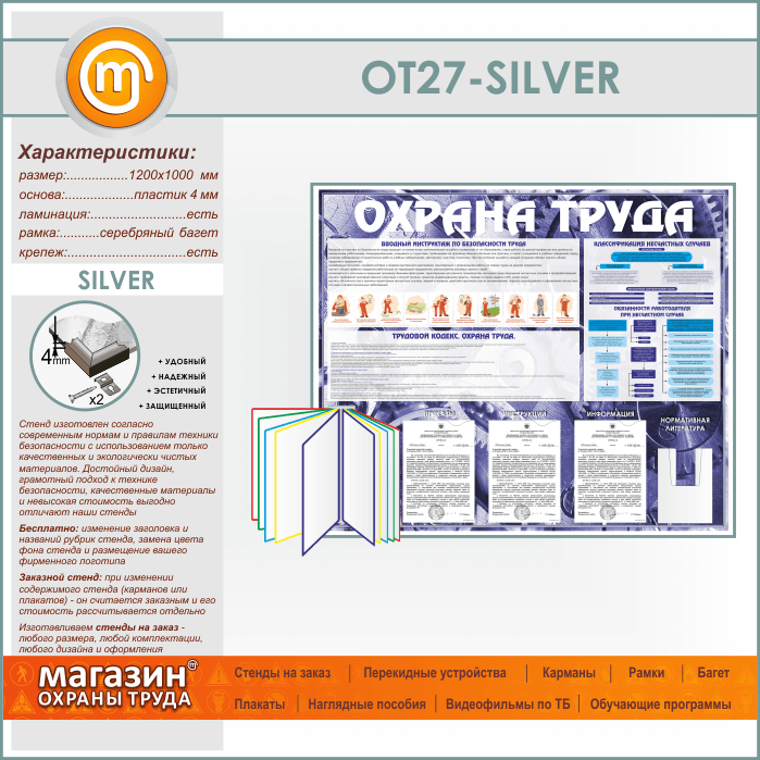 Стенд «Охрана труда» с перекидной системой, 3 плоскими и 1 объемным карманом (OT-27-SILVER) в Сургуте купить