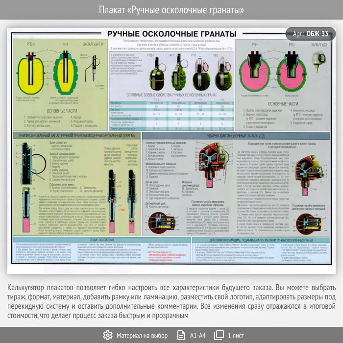 Плакат «Ручные осколочные гранаты» (ОБЖ-33, 1 лист) в Сургуте купить