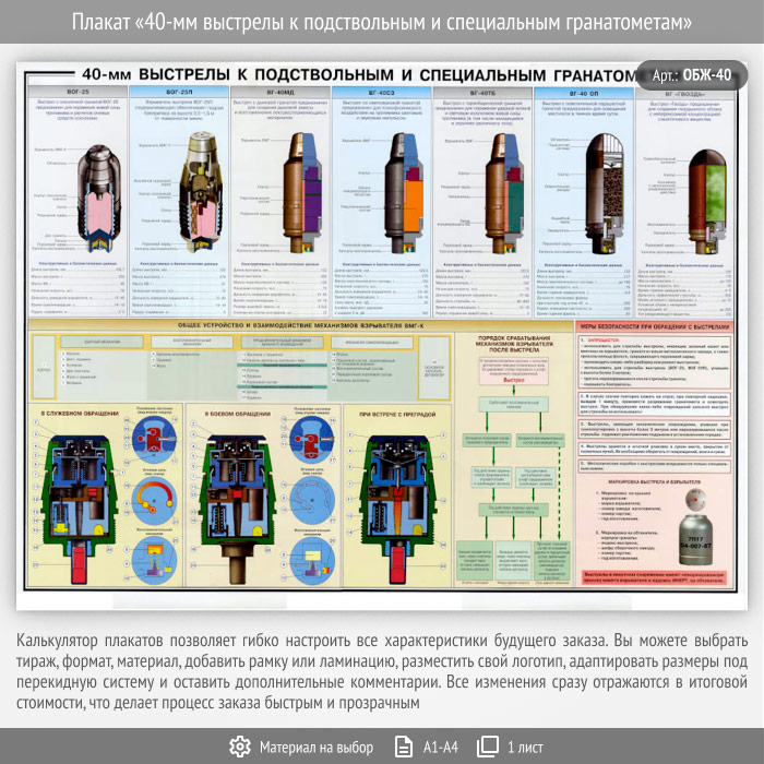 Плакат «40-мм выстрелы к подствольным и специальным гранатометам» (ОБЖ-40, 1 лист) в Сургуте купить