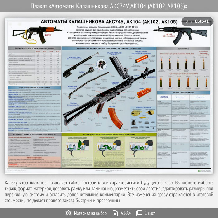 Плакат «Автоматы Калашникова АКС74У, АК104 (АК102, АК105)» (ОБЖ-41, 1 лист) в Сургуте купить