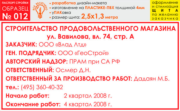 Паспорт стройки, образец № 12 (пластик 4 мм, 2500х1300 cм) в Сургуте купить