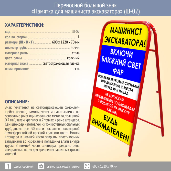 Переносной большой знак «Памятка для машиниста экскаватора» (Ш-02, односторонний, светоотражающая пленка) в Сургуте купить