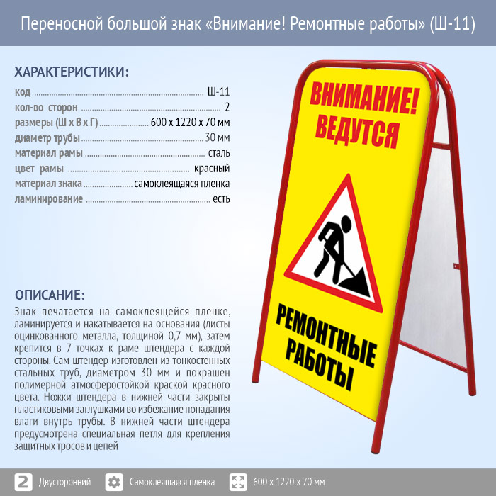 Переносной большой знак «Внимание! Ремонтные работы» (Ш-11, двусторонний, самоклеящаяся пленка) в Сургуте купить