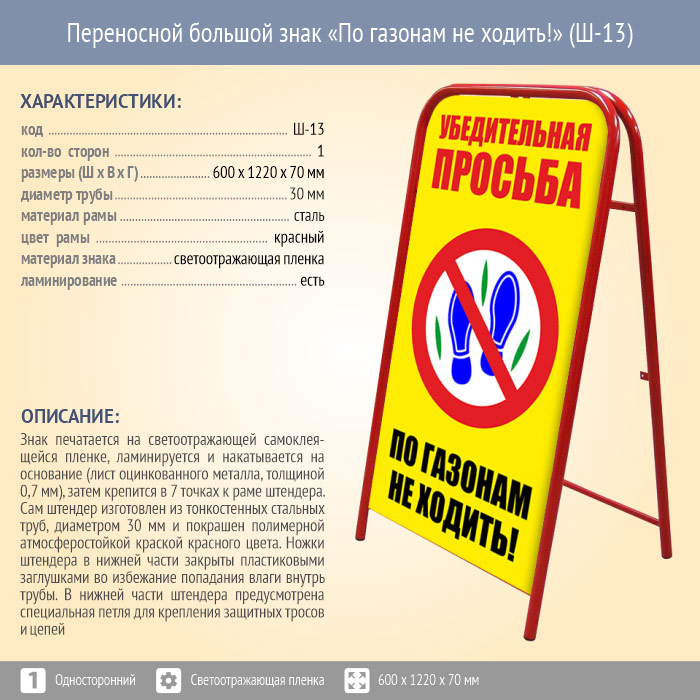 Переносной большой знак «По газонам не ходить!» (Ш-13, односторонний, светоотражающая пленка) в Сургуте купить