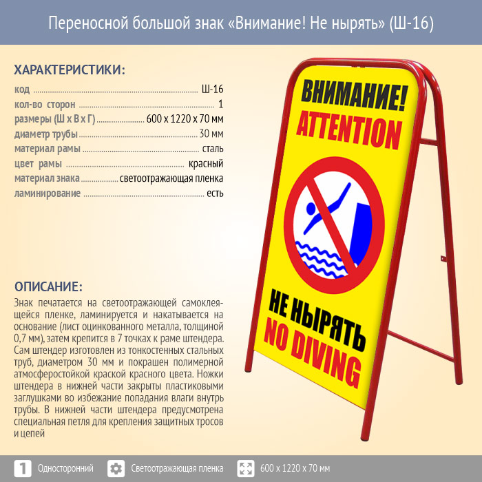 Переносной большой знак «Внимание! Не нырять» (Ш-16, односторонний, светоотражающая пленка) в Сургуте купить
