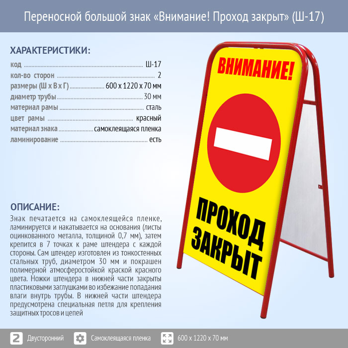 Переносной большой знак «Внимание! Проход закрыт» (Ш-17, двусторонний, самоклеящаяся пленка) в Сургуте купить