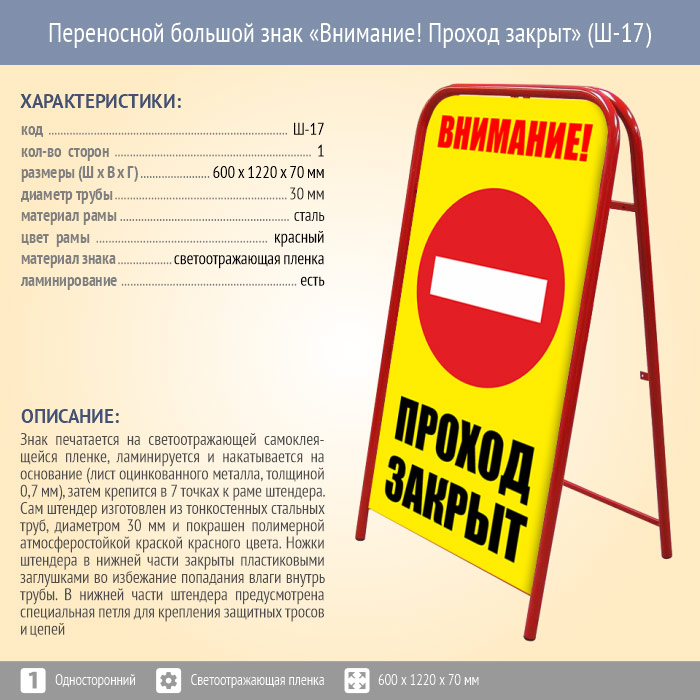 Переносной большой знак «Внимание! Проход закрыт» (Ш-17, односторонний, светоотражающая пленка) в Сургуте купить