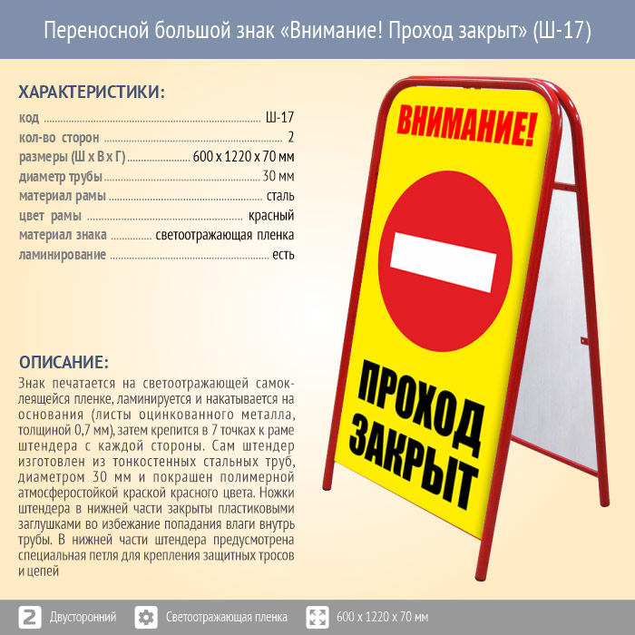 Переносной большой знак «Внимание! Проход закрыт» (Ш-17, двусторонний, светоотражающая пленка) в Сургуте купить