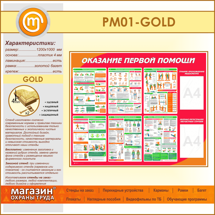Стенд «Оказание первой помощи» с плоским и объемным карманами (PM-01-GOLD) в Сургуте купить