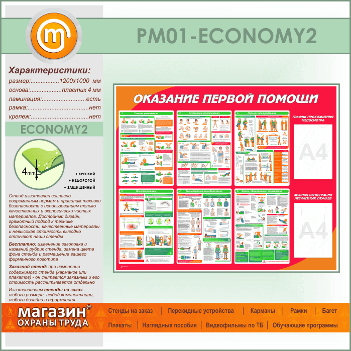 Стенд «Оказание первой помощи» с плоским и объемным карманами (PM-01-ECONOMY2) в Сургуте купить