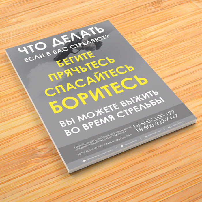 Агитационный плакат «Что делать если в вас стреляют?» может быть изготовлен любого формата и размера, на бумаге, самоклеящейся пленке, пластике, баннерной ткани и металле. Разрабатываем, рисуем и изготавливаем плакаты на любую интересующую Вас тему