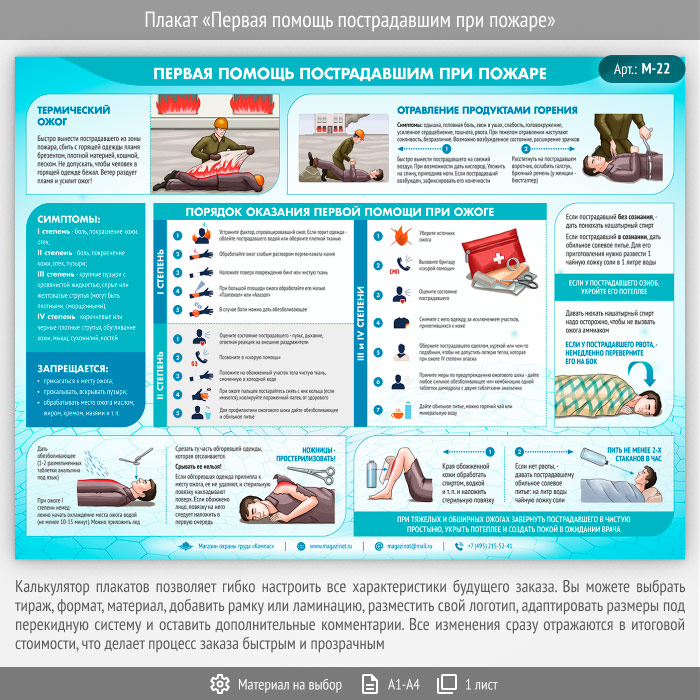 Плакат «Первая помощь пострадавшим при пожаре» может быть изготовлен любого формата и размера, на бумаге, самоклеящейся пленке, пластике, баннерной ткани и металле. Разрабатываем, рисуем и изготавливаем плакаты на любую интересующую Вас тему