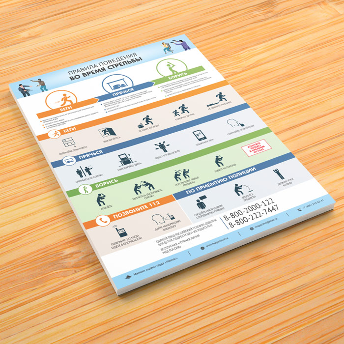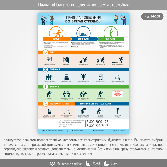 Плакат «Правила поведения во время стрельбы» может быть изготовлен любого формата и размера, на бумаге, самоклеящейся пленке, пластике, баннерной ткани и металле. Разрабатываем, рисуем и изготавливаем плакаты на любую интересующую Вас тематику