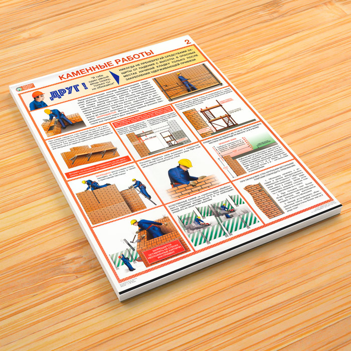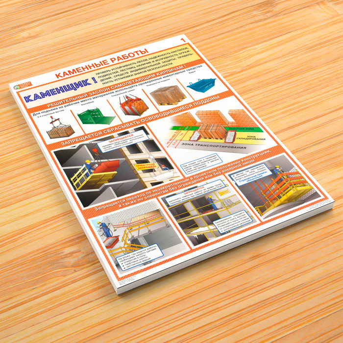Комплект плакатов «Каменные работы. Правила охраны труда» из 2 листов содержит информацию об организации рабочего места каменщика, способах подачи материалов, особенностях выполнения работ в опасных условиях, правилах установки рабочих настилов, использовании средств индивидуальной защиты от падения с высоты. Полезен в качестве дополнительного пособия при проведении инструктажей по охране труда