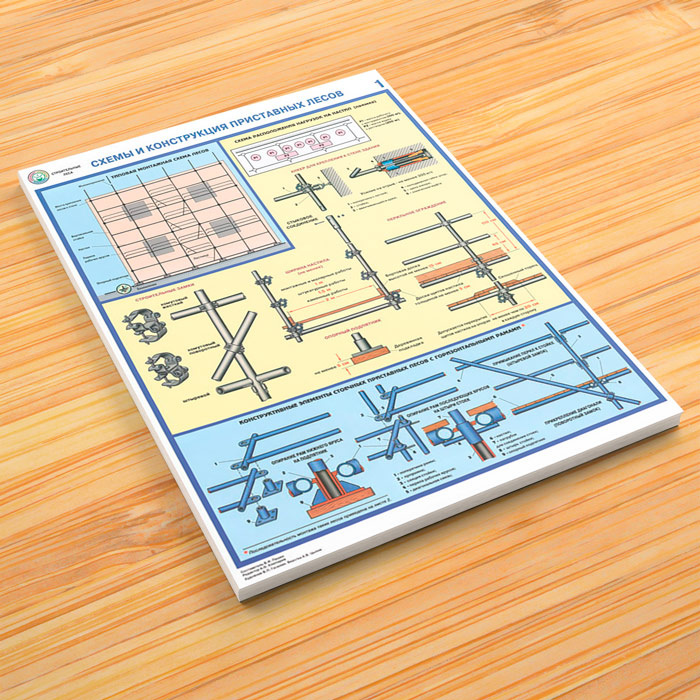 - Плакат «Схема и конструкция приставных лесов» – типовая схема, схема расположения нагрузок на настил, конструктивные элементы стоечных приставных лесов