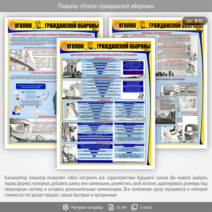 В комплекте плакатов из 3 листов «Уголок гражданской обороны» дается классификация стихийных бедствий, описываются сигналы гражданской обороны, действия персонала при возникновении ЧС, а также правила использования средств индивидуальной защиты