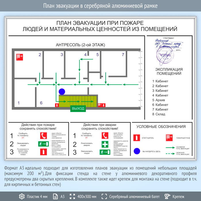 План эвакуации в серебряной алюминиевой рамке (А3 формат) в Сургуте купить