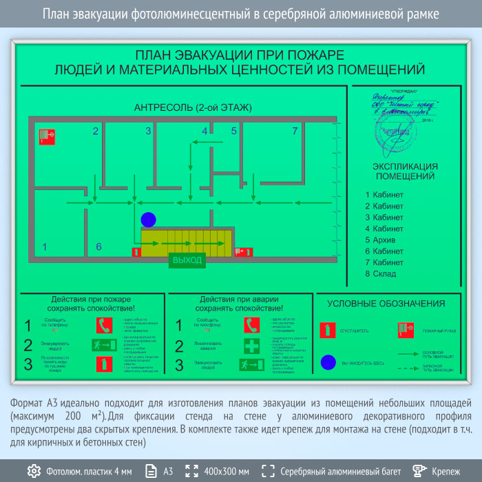 План эвакуации фотолюминесцентный в серебряной алюминиевой рамке (А3 формат) в Сургуте купить
