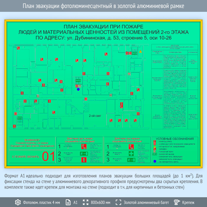План эвакуации фотолюминесцентный в золотой алюминиевой рамке (А1 формат) в Сургуте купить