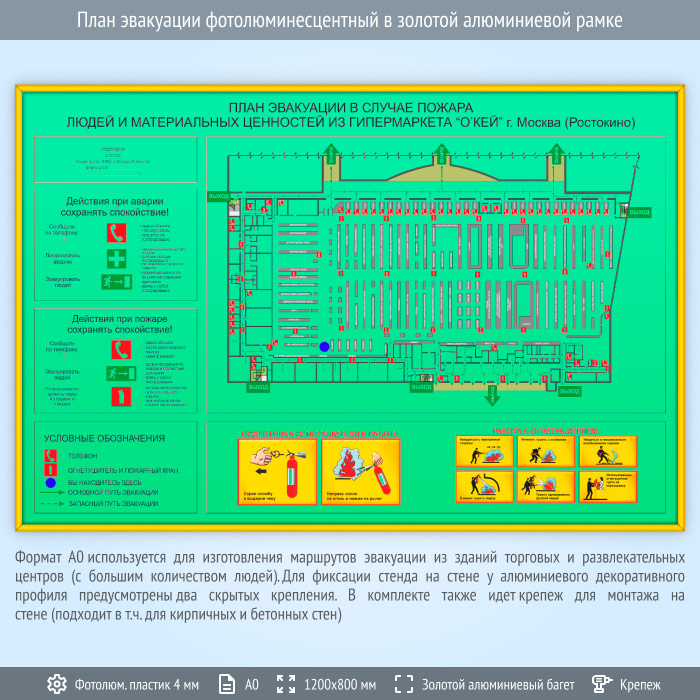 План эвакуации фотолюминесцентный в золотой алюминиевой рамке (А0 формат) в Сургуте купить