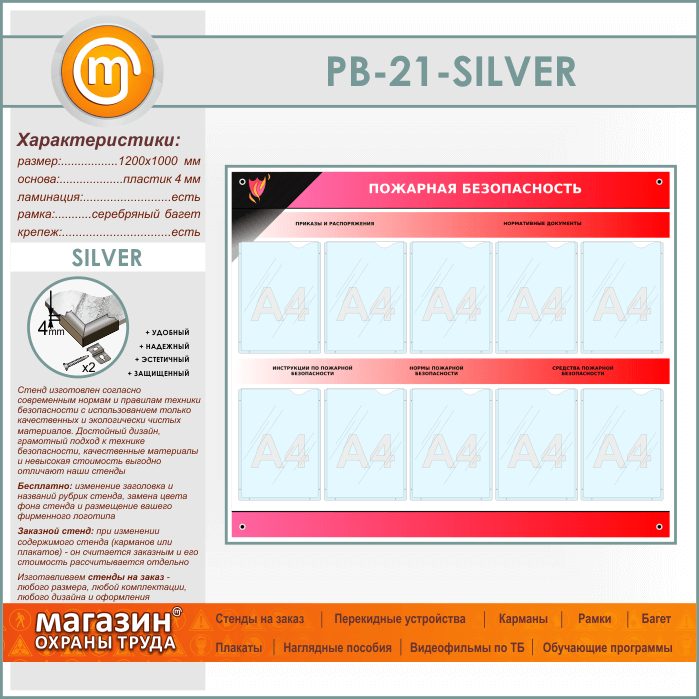 Стенд «Пожарная безопасность» с 10 карманами (PB-21-SILVER) в Сургуте купить
