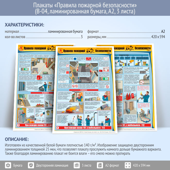 Плакаты «Правила пожарной безопасности» (В-04, ламинированная бумага, А2, 3 листа) в Сургуте купить