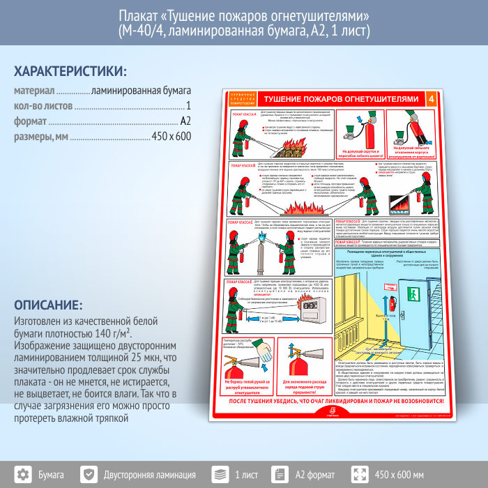 Плакат «Тушение пожаров огнетушителями» (М-40/4, ламинированная бумага, А2, 1 лист) в Сургуте купить