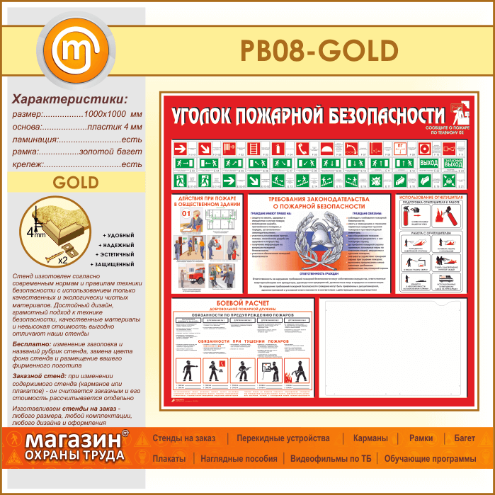 Стенд «Уголок пожарной безопасности» с карманом А3 формата (PB-08-GOLD) в Сургуте купить