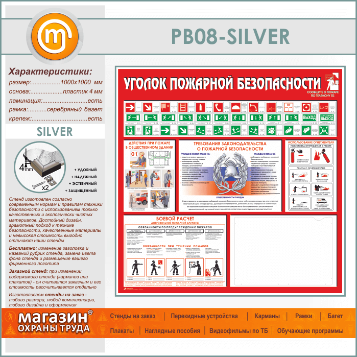 Стенд «Уголок пожарной безопасности» с карманом А3 формата (PB-08-SILVER) в Сургуте купить