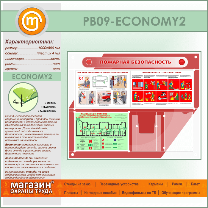Стенд «Пожарная безопасность» с планом эвакуации, плоским и объемным карманами (PB-09-ECONOMY2) в Сургуте купить