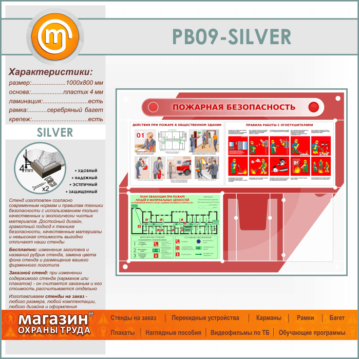 Стенд «Пожарная безопасность» с планом эвакуации, плоским и объемным карманами (PB-09-SILVER) в Сургуте купить