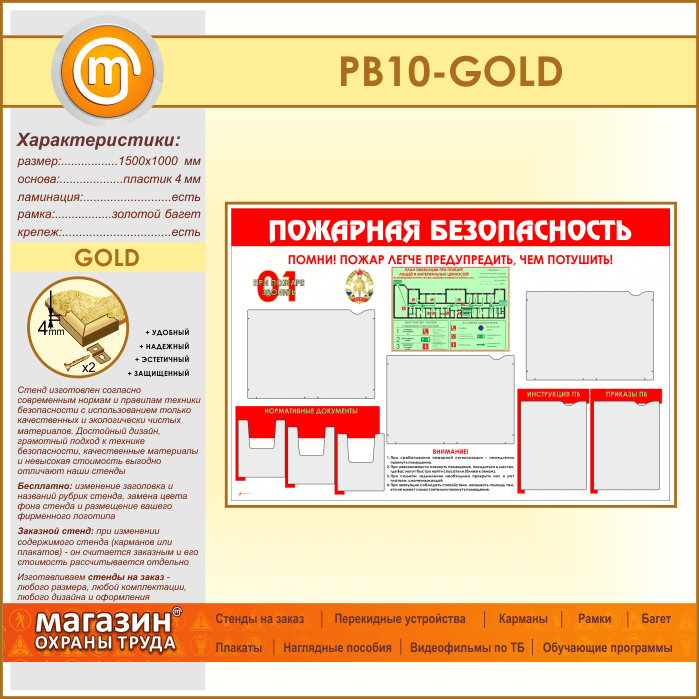 Стенд «Пожарная безопасность» с планом эвакуации, 5 плоскими и 3 объемными карманами (PB-10-GOLD) в Сургуте купить