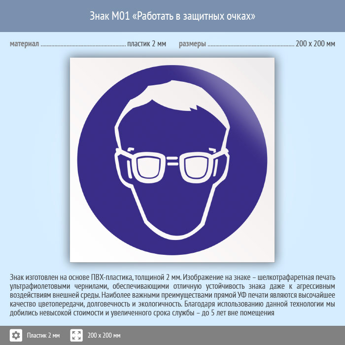 Знак M01 «Работать в защитных очках» (пластик, 200х200 мм) в Сургуте купить