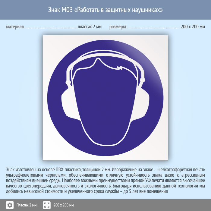 Знак M03 «Работать в защитных наушниках» (пластик, 200х200 мм) в Сургуте купить