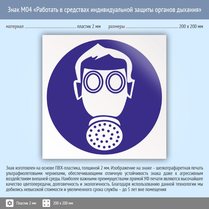 Знак M04 «Работать в средствах индивидуальной защиты органов дыхания» (пластик, 200х200 мм) в Сургуте купить