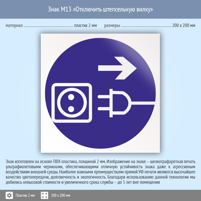 Знак M13 «Отключить штепсельную вилку» (пластик, 200х200 мм) в Сургуте купить