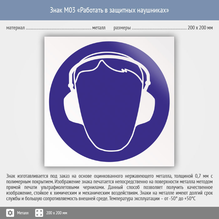 Знак M03 «Работать в защитных наушниках» (металл, 200х200 мм) в Сургуте купить