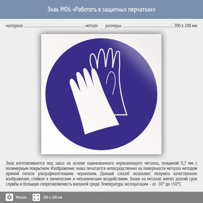 Знак M06 «Работать в защитных перчатках» (металл, 200х200 мм) в Сургуте купить
