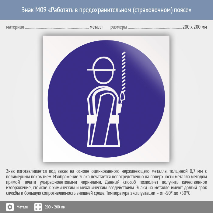Знак M09 «Работать в предохранительном (страховочном) поясе» (металл, 200х200 мм) в Сургуте купить