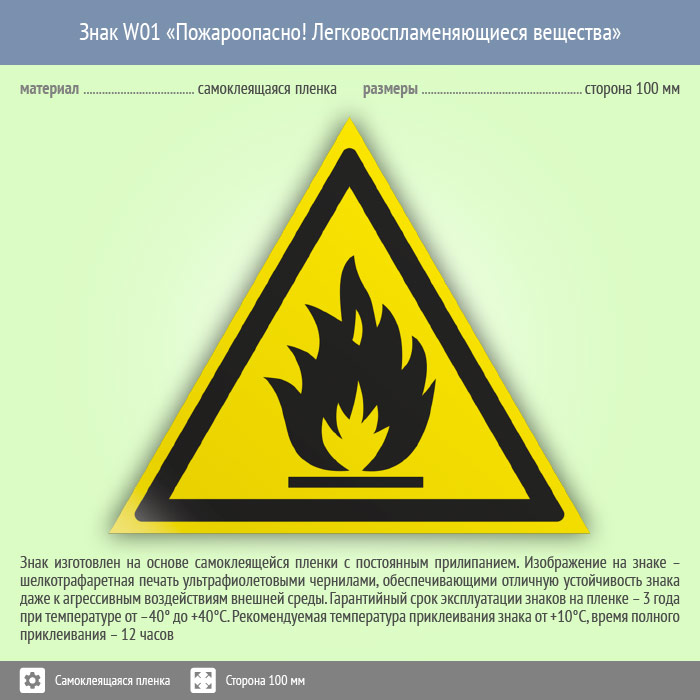 Знак W01 «Пожароопасно! легковоспламеняющиеся вещества» (пленка, сторона 100 мм) в Сургуте купить