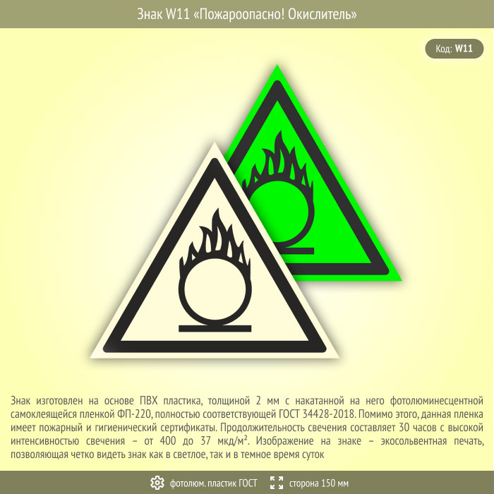 Знак W11 «Пожароопасно! Окислитель» (фотолюминесцентный пластик ГОСТ 34428-2018, сторона 150 мм) в Сургуте купить