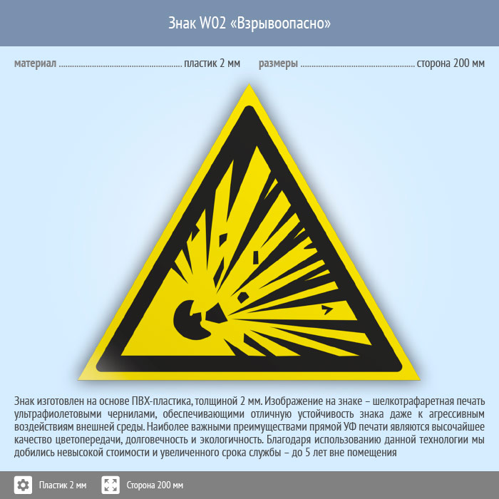 Знак W02 «Взрывоопасно» (пластик, сторона 200 мм) в Сургуте купить