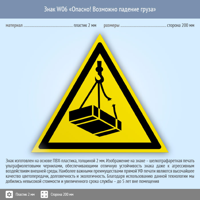 Знак W06 «Опасно! возможно падение груза» (пластик, сторона 200 мм) в Сургуте купить