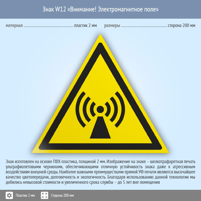 Знак W12 «Внимание! электромагнитное поле» (пластик, сторона 200 мм) в Сургуте купить