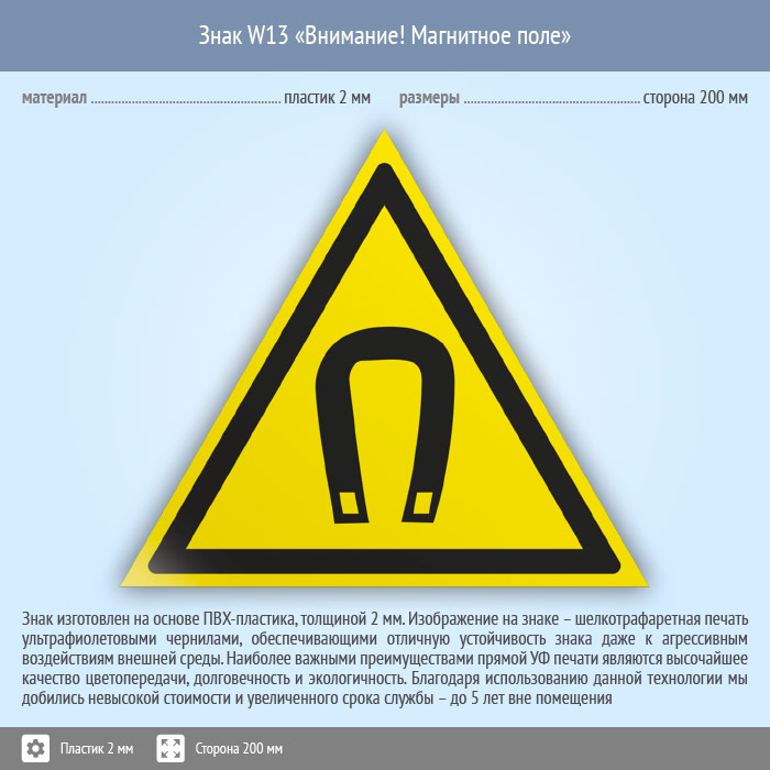 Знак W13 «Внимание! магнитное поле» (пластик, сторона 200 мм) в Сургуте купить