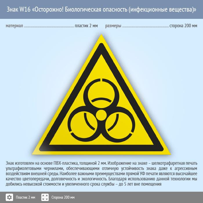 Знак W16 «Осторожно! биологическая опасность (инфекционные вещества)» (пластик, сторона 200 мм) в Сургуте купить