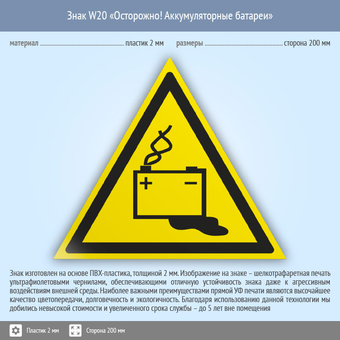 Знак W20 «Осторожно! аккумуляторные батареи» (пластик, сторона 200 мм) в Сургуте купить
