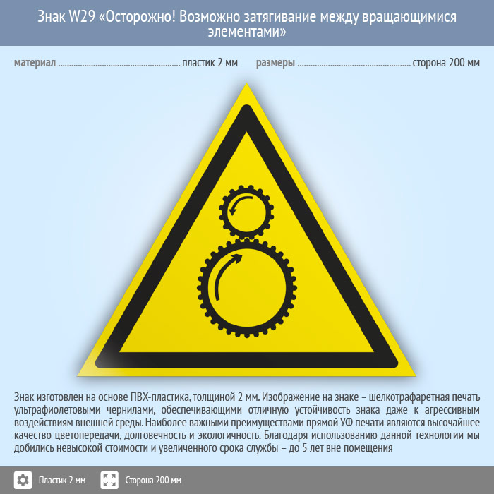Знак W29 «Осторожно! возможно затягивание между вращающимися элементами» (пластик, сторона 200 мм) в Сургуте купить